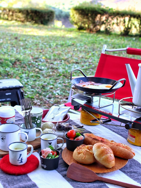 というわけで、夫がまた火をおこしてくれたので、地道にお湯をわかし、地道にベーコンエッグを焼く。