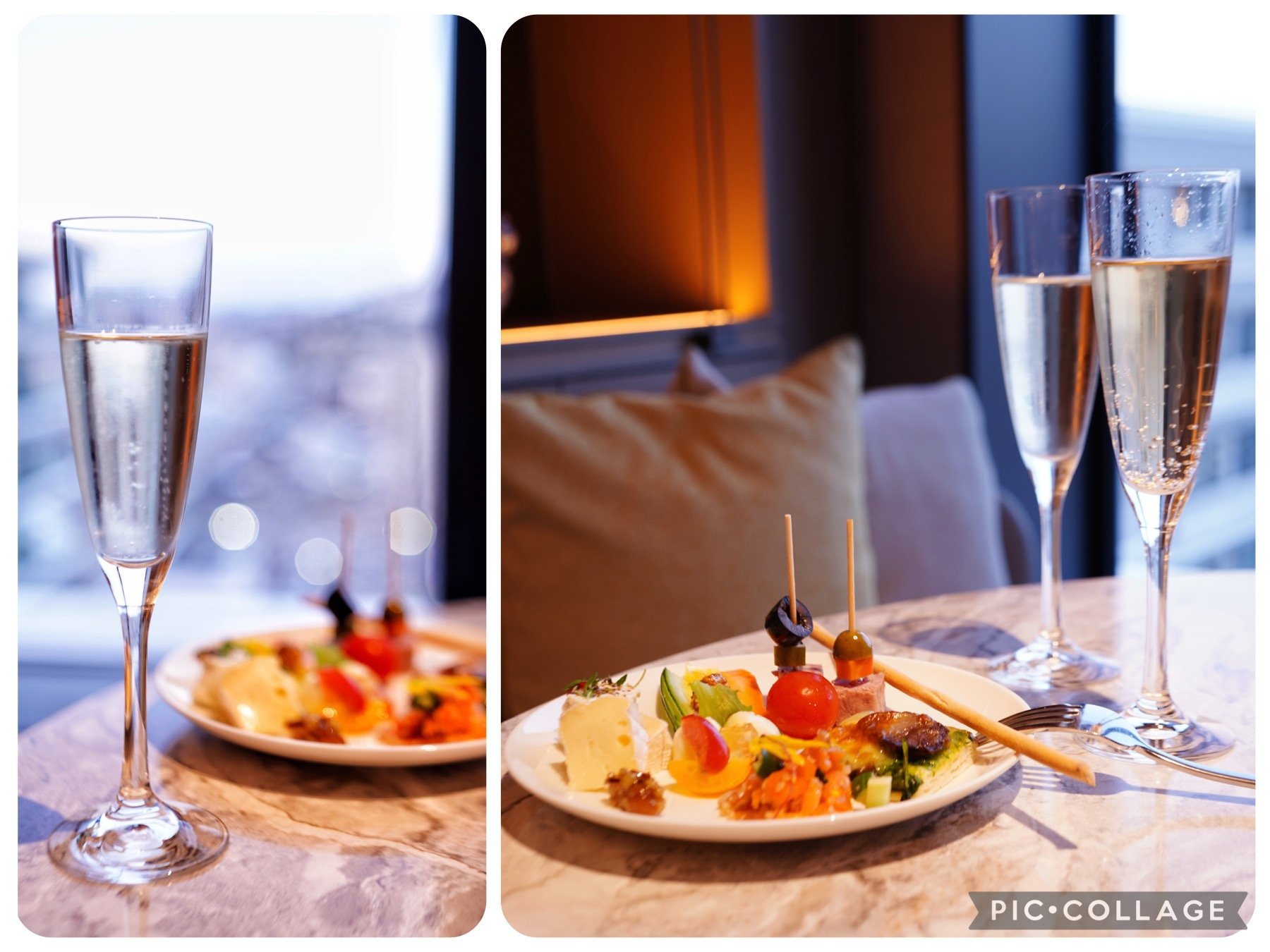 夜ごはんはアミュで皿うどんとかにすれば?(私、全然食べる気ない)とか言ってたんだけど、はからずもクラブラウンジが利用できることになったので、カクテルタイムにとりあえず行ってみる。