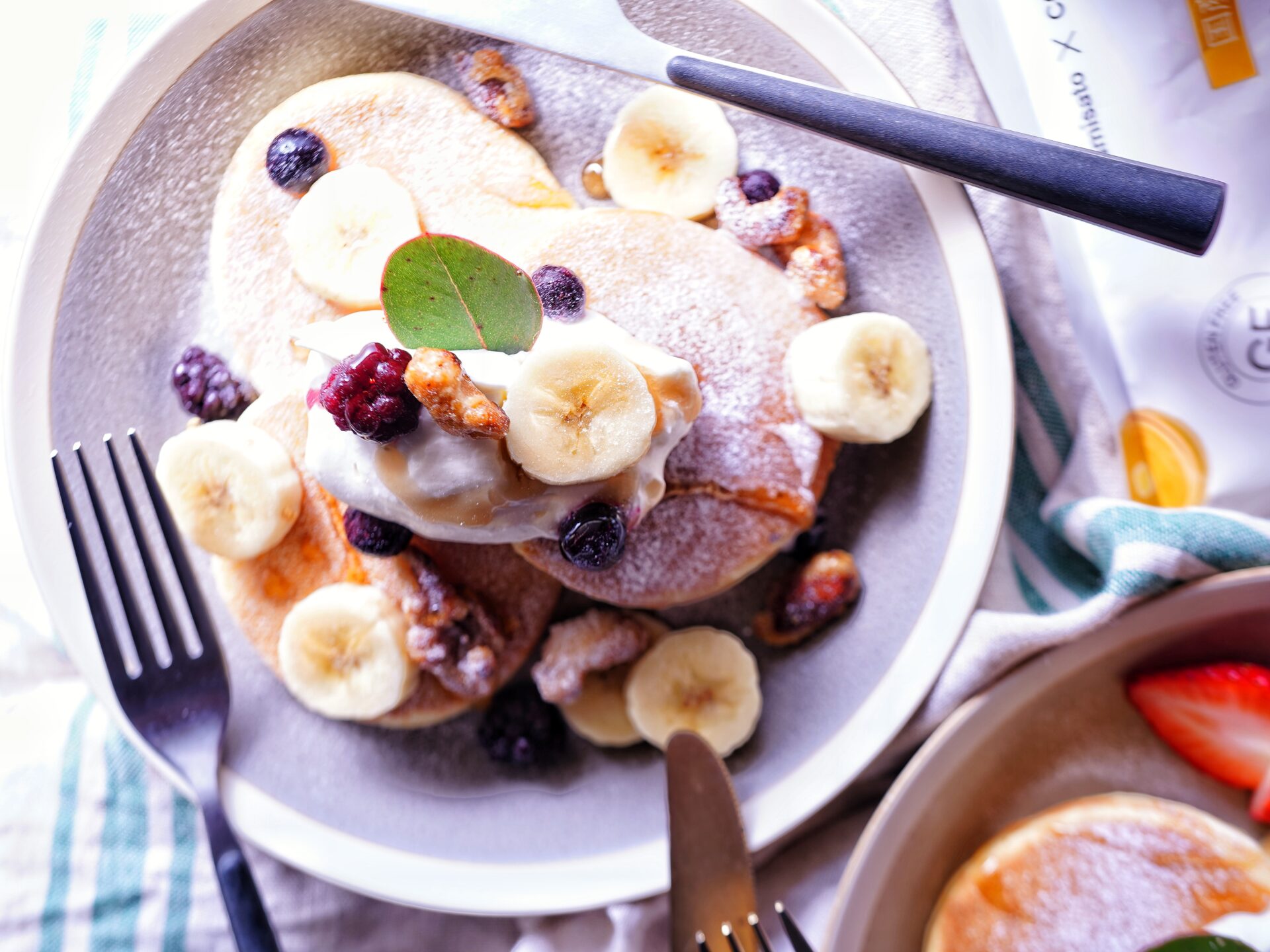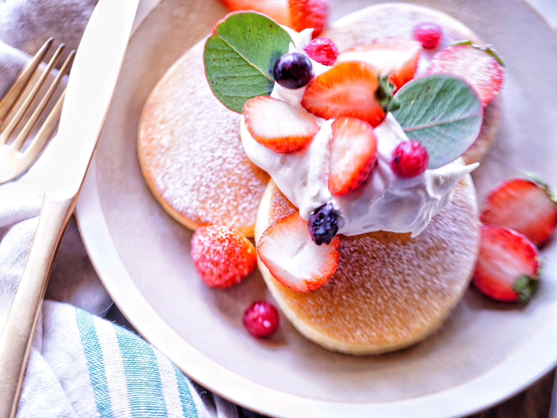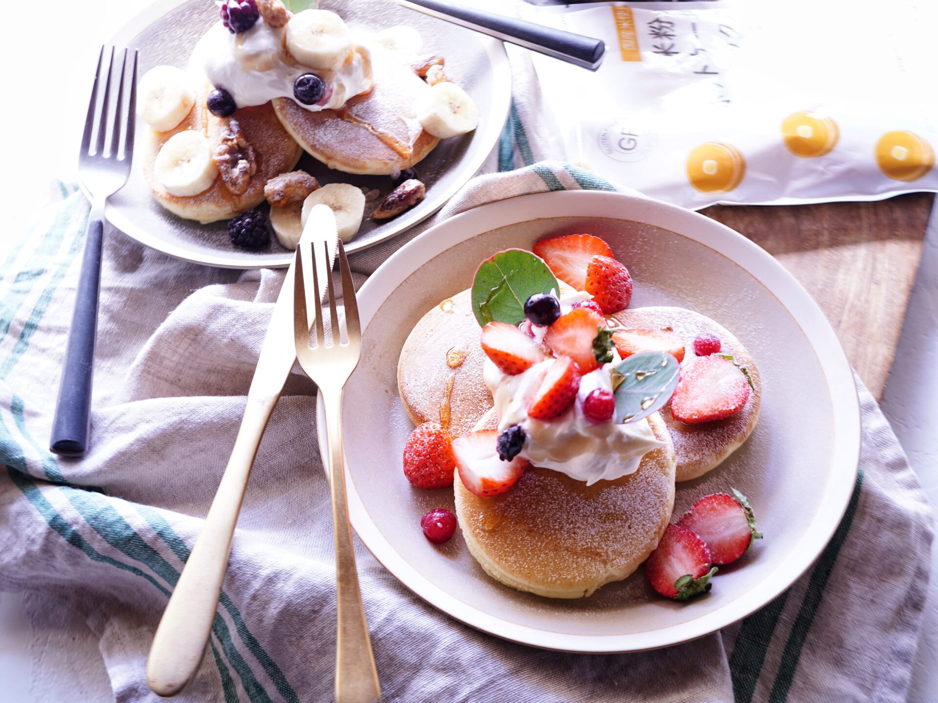 週末の朝ごはんに、ひっさびさ焼いたパンケーキ。