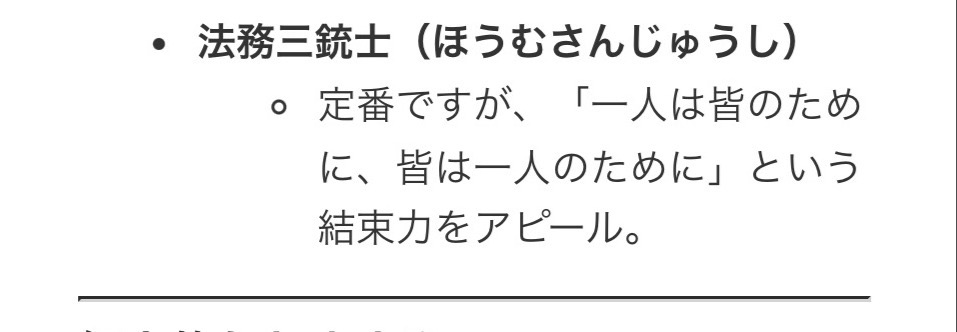 とりあえず、めっちゃ普通の名前つけて(普通過ぎて書けない)にして、「一応『法務三銃士』って提案もありました」って書いた(書いたんか)んだけど、なんか…いいねついてた(笑)