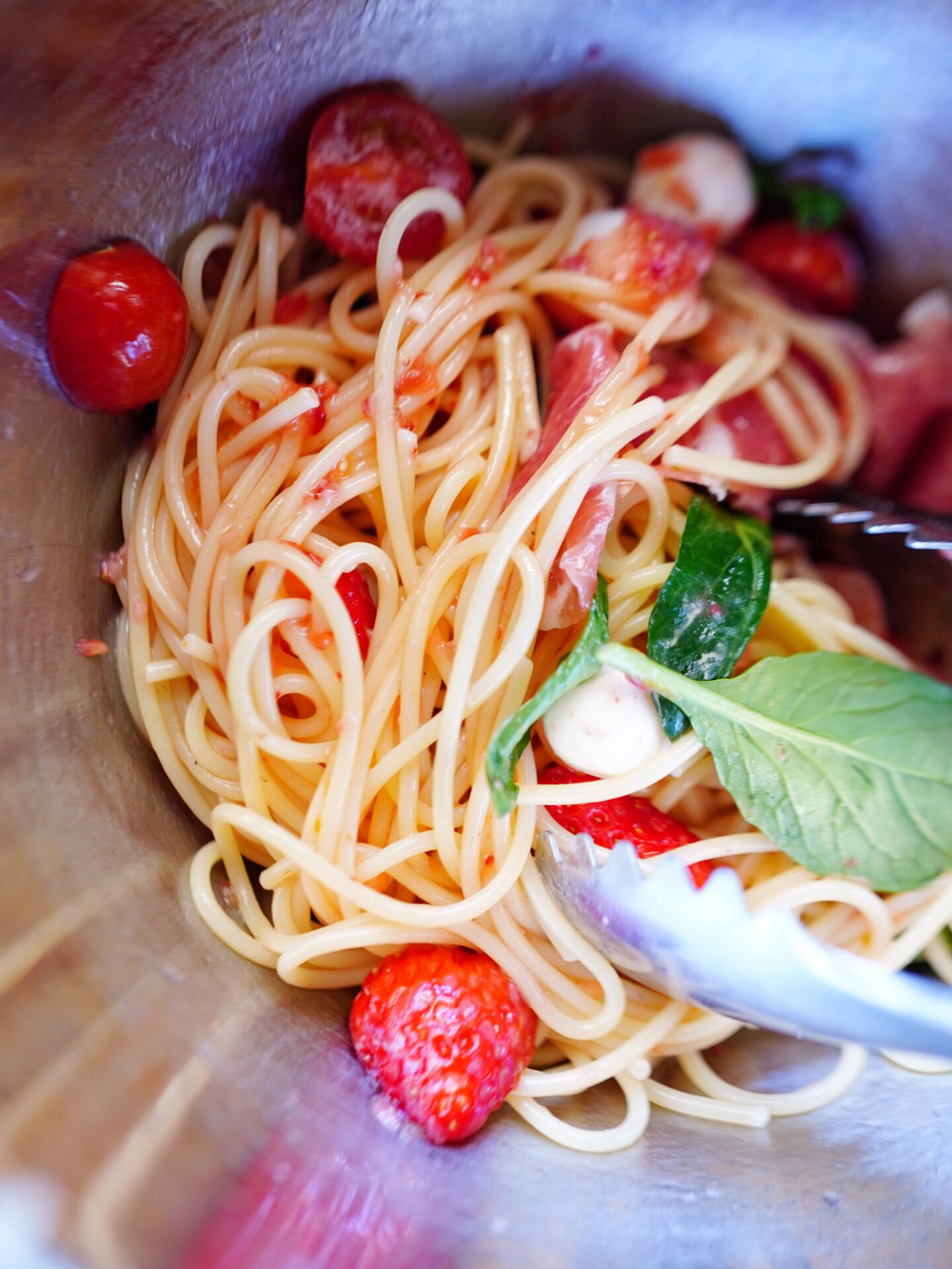 ⑤ スパゲッティに、半分に切ったいちごとミニトマト、モッツァレラチーズ、生ハム、ベビーリーフを入れ、③を回しかけてマリネする。にんにく塩を振って味を調える。